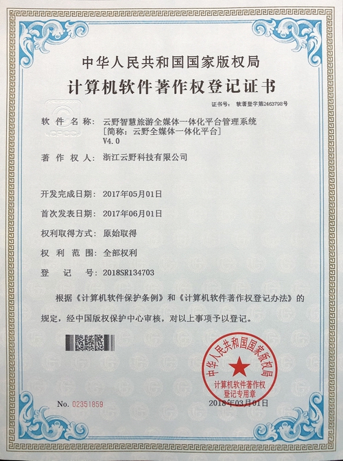 《云野智慧旅游全媒體一體化平臺管理系統(tǒng)V4.0》于2018年3月1日被正式授予《中華人民共和國國家版權(quán)局計算機軟件著作權(quán)登記證書》,登記號為2018SR134703。