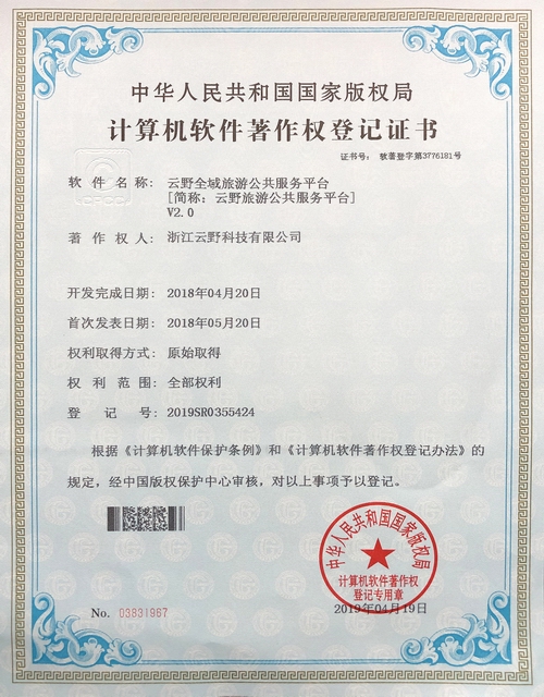《云野全域智慧旅游景區(qū)綜合管控平臺V2.0》于2019年4月19日被正式授予《中華人民共和國國家版權(quán)局計算機軟件著作權(quán)登記證書》,登記號為2019SR0352573。