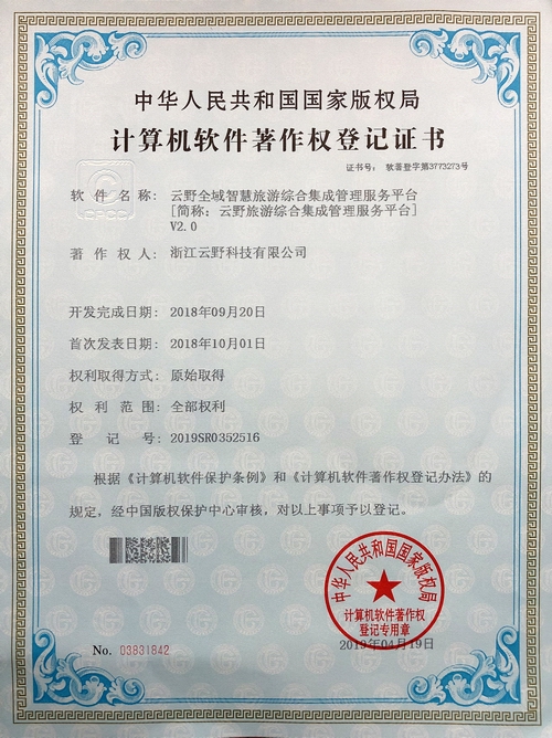 《云野全域智慧旅游綜合集成管理服務(wù)平臺V2.0》于2019年4月19日被正式授予《中華人民共和國國家版權(quán)局計算機軟件著作權(quán)登記證書》,登記號為2019SR0352516。