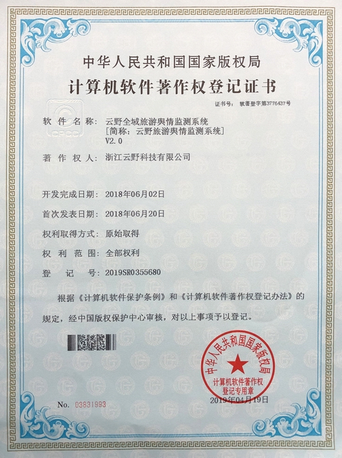 《云野全域旅游輿情監(jiān)測系統(tǒng)V2.0》于2019年4月19日被正式授予《中華人民共和國國家版權(quán)局計算機軟件著作權(quán)登記證書》,登記號為2019SR0355680。