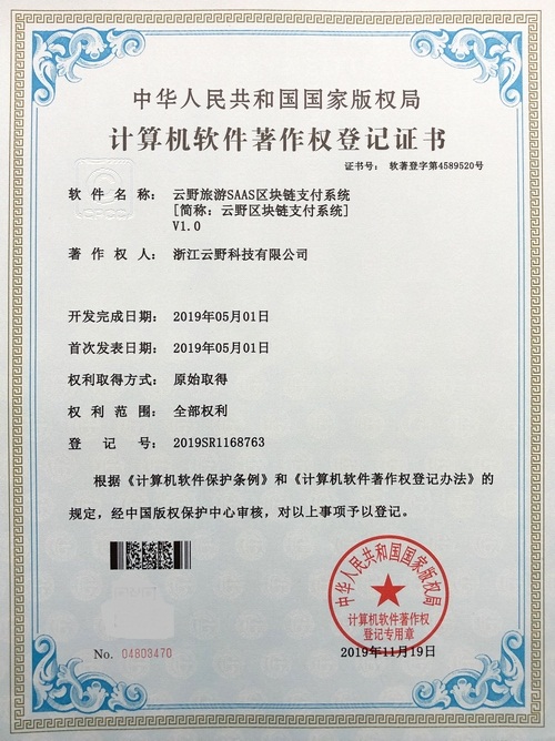 《云野旅游SAAS區(qū)塊鏈支付系統(tǒng)V1.0》于2019年11月19日被正式授予《中華人民共和國國家版權(quán)局計算機軟件著作權(quán)登記證書》,登記號為2019SR1168763。